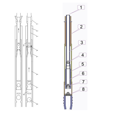 En la carrera ascendente, el émbolo asciende, el volumen de la cámara de trabajo inferior B aumenta, la presión disminuye, la válvula de estacionamiento 8 se abre y el petróleo y el gas entran en la cámara B. Mientras tanto, el volumen de la cámara de trabajo superior A disminuye, la mezcla de petróleo y gas en la cámara A se comprime por segunda vez, la presión aumenta, la válvula de desplazamiento superior 4 se abre, la válvula de desplazamiento inferior 7 se cierra y la mezcla de petróleo y gas se descarga de la bomba a través del émbolo superior. Durante la carrera descendente, el émbolo desciende, el volumen de la cámara B disminuye, la presión aumenta, el volumen de la cámara A aumenta y la presión disminuye. Debido a la diferencia de presión entre las cámaras A y B, la válvula de desplazamiento inferior 7 se abre rápidamente y la mezcla de petróleo y gas de la cámara B ingresa a la cámara A. Dado que el área anular de la cámara de trabajo inferior B es mayor que la de la cámara de trabajo superior A, cuando todo el petróleo y el gas de mayor volumen de la cámara de trabajo inferior B ingresan a la cámara de trabajo superior A de menor volumen, el volumen de petróleo y gas se comprime (en esencia, el gas se comprime) y la presión aumenta.